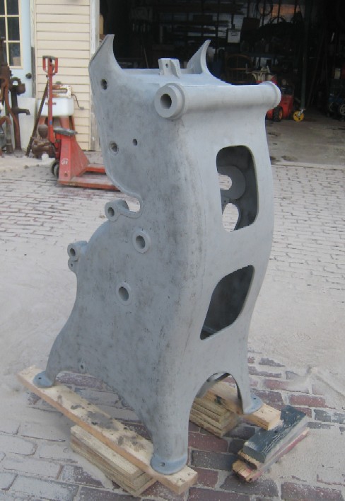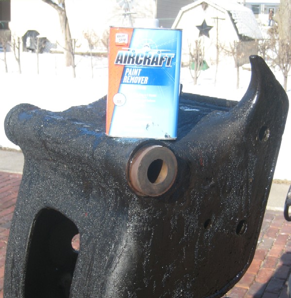 Before I moved the press outside into the cold I brushed a nice coat of "Aircraft" paint remover across the base. This helps reduce sandbasting time. The spots you see all wrinkled up in the picture just fly off when I hit that area with the blaster. Not only does it help in removing the paint, but it also softens up any caked on oil around the bushings. On this project it also soften up dried ink, and in some spots the ink was very thick!!! Surprise Surprise.