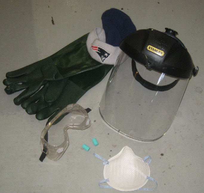 My normal sandblasting system is in a closet that you sit your hands into and look through a window. You don't get very dirty and normal street clothes can be wore. But since the base it to large the blaster had to be moved outside. With that comes proper sandblasting gear. Safety items shown below are a must. Eye protection, ear plugs, dust mask, face shield, gloves, and a stocking cap are required. Long sleeve shirt and pants too. All parts of your body need covered because sand will hit you somewhere and it HURTS when it hits.....and if it's the wrong spot you might get hurt requiring medical attention. Be safe, Cover it!!!! After about 4 hours outside the base if finally blasted clean. A couple times I stopped and applied more paint remover to loosen ink and grease. I also got out the putty knife and pick and did lots of scraping in corners and edges. The base is ready for the next step!!!