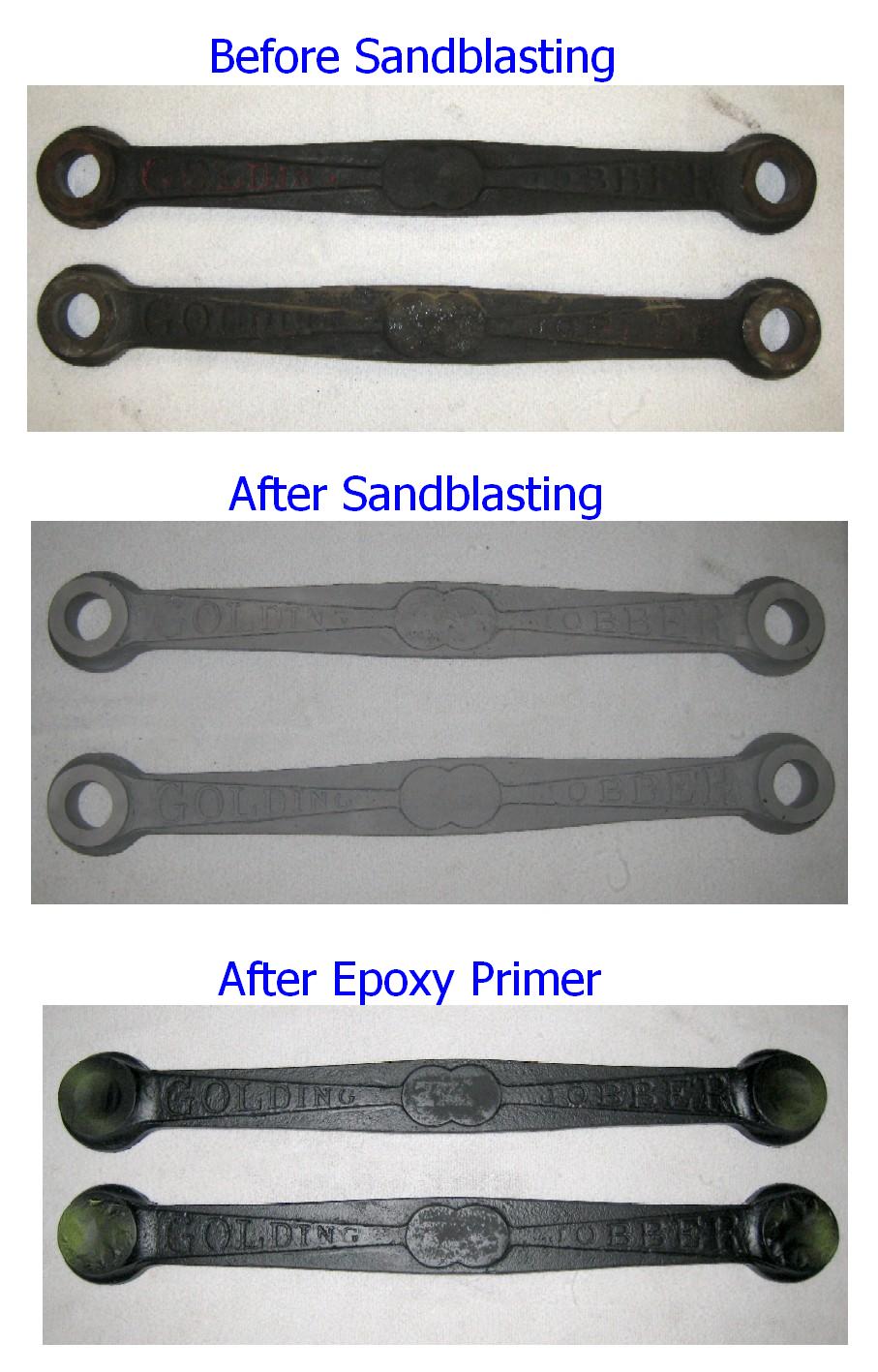 The next three pictures show the draw bars in the first three steps of restoration. First picture is the draw bars removed from the press ready for sandblasting. The second photo shows the same bars after sand blasting. All the paint, ink and rust removed. The third picture shows after the bars are in epoxy primer. Still have polyester primer, sanding....maybe more polyester primer/filler, sanding, sealing, and then painting. Stay tuned to this site for later updates.....these draw bars are very colorful when completed.